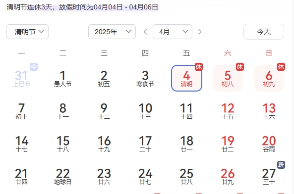 根據(jù)國家2025年春節(jié)放假通知并結合本司實際情況,放假做以下調整:1、放假時間:2025年4月4日至2025年4月6號,共3天,3月7號正常上···